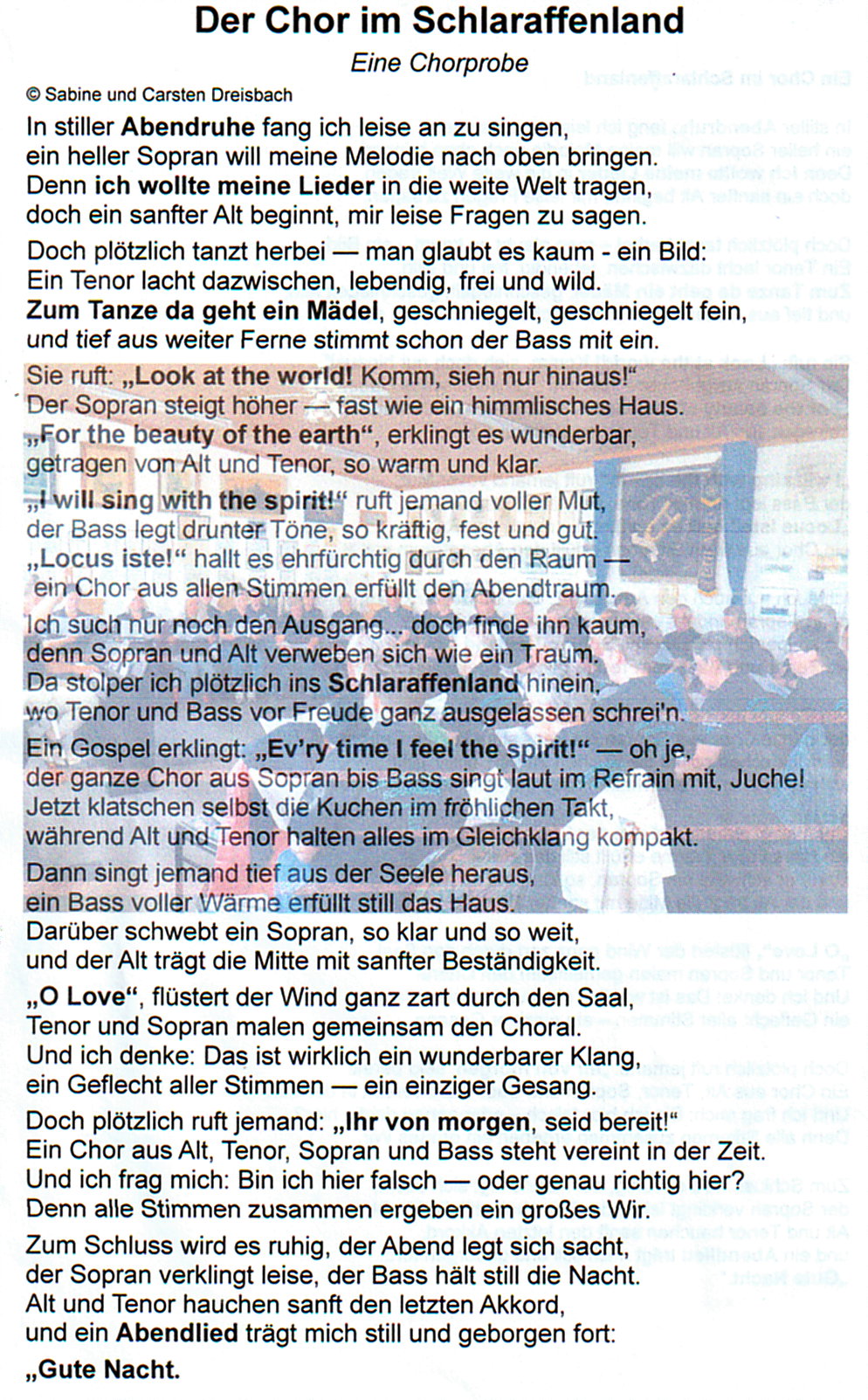 Sabine und Carsten gaben einen Einblick in das (ambitionierte) Probengeschehen des Chores in Gedichtform. Wir haben nicht nur Gesangstalente sondern auch literarische Talent im Chor. Toll!